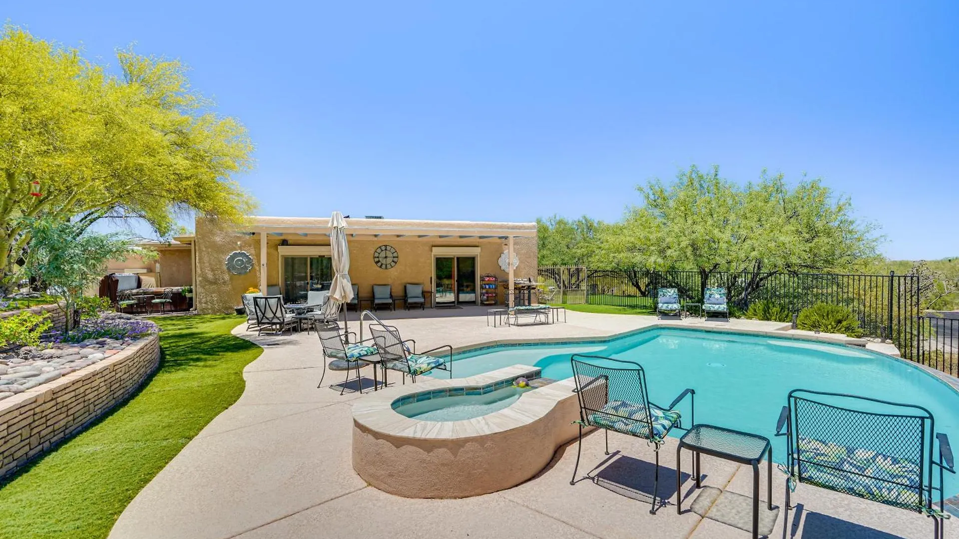 The kitchen amenities at the accommodation feature a fridge, a cooktop, and a kitchenware, provided in an outdoor dining area. Tucson International airport is located a 38-minute drive from the welcoming villa.